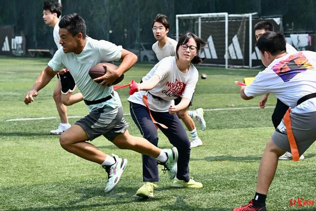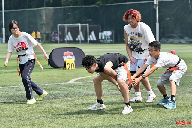 2007年出生的杨雅晴是成都外国语学校接触腰旗橄榄球运动较早的一名同学,去年她曾在成都熊猫人美式橄榄球俱乐部的女子橄榄球队中实习过,了解和学习了这项运动。今年夏天,成都外国语学校开设了橄榄球体验课,杨雅晴也报名参加了,这让她对腰旗橄榄球运动产生了更加浓厚的兴趣。她告诉红星新闻记者:“首先这项运动趣味性很强,也能够锻炼一个人各方面的能力。其次,通过这项运动,还能起到社交的作用 。”