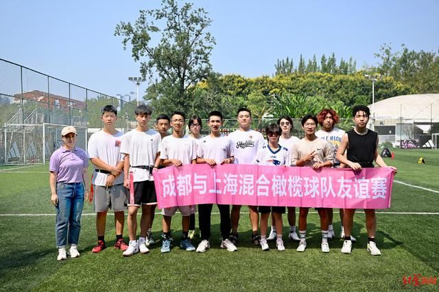 9月3日上午,一场腰旗橄榄球比赛在成都市锦江区晨辉西路的一个足球场上进行着,场边几个成年人和小朋友在为他们助威。比赛双方没有统一装备比赛服,基本都穿着运动T恤,看起来十分普通。但仔细观察,却能发现比赛的物资准备十分充分,除了比赛器材外,饮用水、功能性饮料以及林林总总的医疗用品都整齐地陈列在场边,写有“成都与上海混合橄榄球友谊赛”字样的横幅、对阵双方互换礼物的仪式也显示着这场比赛似乎又没有那么简单。