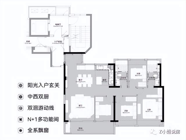 建筑面积约128㎡四房两厅两卫,四开间朝南,双阳台设计,中西双厨,双洄游动线,主卧为套房设计带步入式衣帽间和独立卫生间。