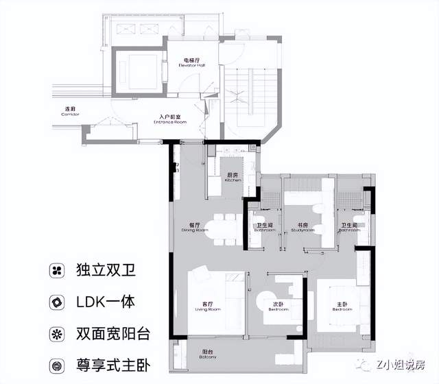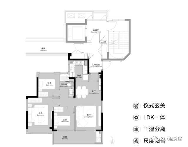 建筑面积约105㎡的三房两厅两卫,LDK一体设计,双阳台,主卧为套房设计带独立卫生间。