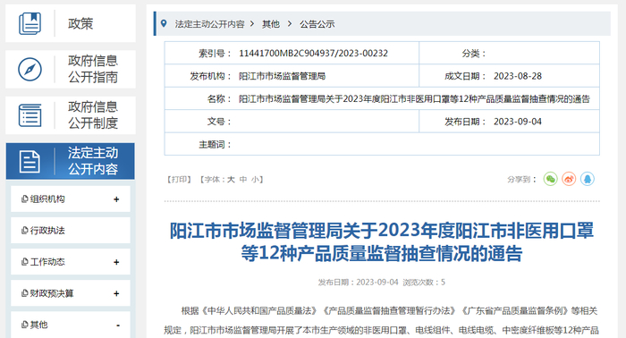 中国质量新闻网讯 2023年9月4日,广东省阳江市市场监督管理局网站发布关于2023年度阳江市非医用口罩等12种产品质量监督抽查情况的通告。