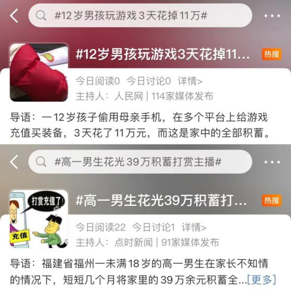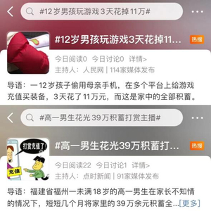 “12岁男孩玩游戏3天花掉11万”“高一男生花光39万积蓄打赏主播”……近年来,未成年人巨款打赏主播、充值网络游戏的事件频现网络,引起社会各界广泛关注。