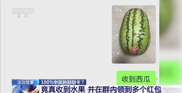 兑奖的人们进群后,管理员发了一个通知,要求大家发图片晒出自己收到的精品水果,晒图后就可以领取10元红包。出乎齐先生的意料,他真的收到了外卖骑手配送的一个20多斤重的大西瓜。齐先生拍照发到群内,也确实领到了10元红包。