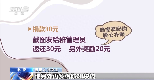 被害人 徐女士:直观这么看,就让你觉得参加这个活动的人特别多。比如你先捐助30块钱,然后完事截图给他,他不光把30块钱返还给你,他另外再多给你20块钱,说这个是商家给予奉献爱心的一个补助、一个奖励。