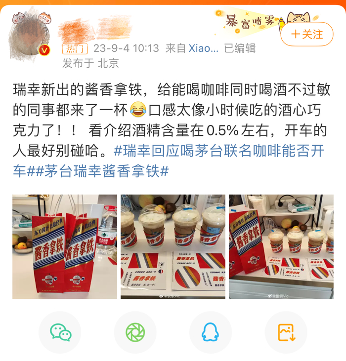 9月4日,贵州茅台(600519.SH)与瑞幸咖啡(Pink:LKNCY)推出的联名咖啡“酱香拿铁”正式开卖,单杯定价38元,券后售价为19元一杯。当天,酱香拿铁销售火爆,“酱香拿铁”、“瑞幸回应喝茅台联名咖啡能否开车”、“满杯茅台去咖啡液”、“瑞幸客服回应酱香拿铁不加咖啡液”等多个相关话题冲上微博热搜。