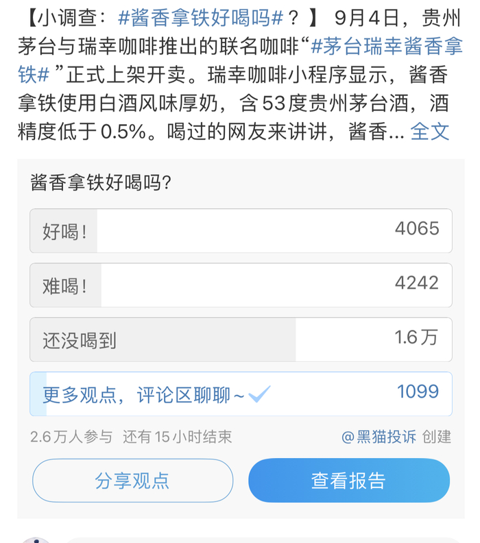 在另一个“你觉得酱香拿铁味道怎么样?”的投票中,7946人参与投票,3784人表示还没喝;2103人选择“不好喝,不喜欢酒味”;2059人选择“好喝,我要美酒加咖啡”。