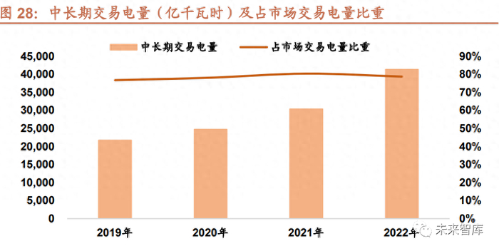 市场化交易电量占比持续提升,目前占比超 60%,其中中长期交易占比接近 80%。 随着电力市场的不断完善和市场主体的增多,市场化交易电量占比持续提升。 2022 年,全国各电力交易中心累计组织完成市场交易电量 52543.4 亿千瓦时, 同比增长 39%,占全社会用电量比重为 60.8%,同比提高 15.4 个百分点。我国 的电力市场化交易主要为中长期交易,能够为电力企业、大型工业用户以及发电 设备投资者提供了长期交易的可靠保障,促进资源配置的合理性和市场稳定性。 2022 年,全国电力市场中长期电力直接交易电量合计为 41407.5 亿千瓦时,同 比增长 36.2%,占市场化交易电量的比例为 78.8%。其中,省内电力直接交易(含 绿电、电网代购)电量合计为 40141 亿千瓦时,占中长期交易电量比重为 96.9%。