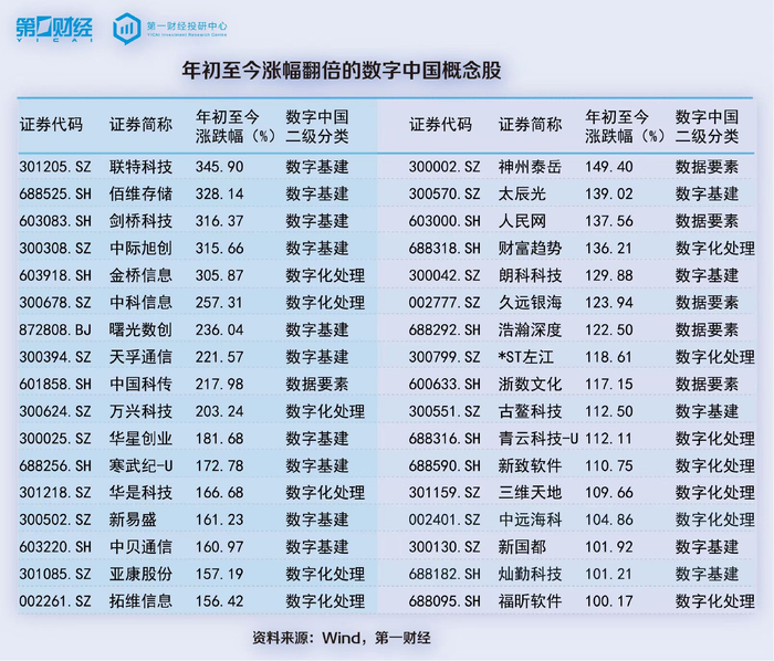 在558家数字中国概念股中,今年以来股价上涨的超400家,其中34只个股股价涨幅超100%。剔除2023年上市次新股,涨幅前5的数字中国概念股分别是联特科技(345.9%)、佰维存储(328.1%)剑桥科技(316.4%)、中际旭创(315.7%)、金桥信息(305.9%)。