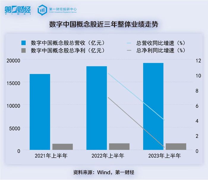 统计显示,数字中国概念股2023年上半年总营收为19188.7亿元,同比增长3.92%;整体归母净利润为1444.4亿元,同比增长0.32%;同期全部A股整体营收同比增长2.57%,整体净利润同比下跌5.33%。