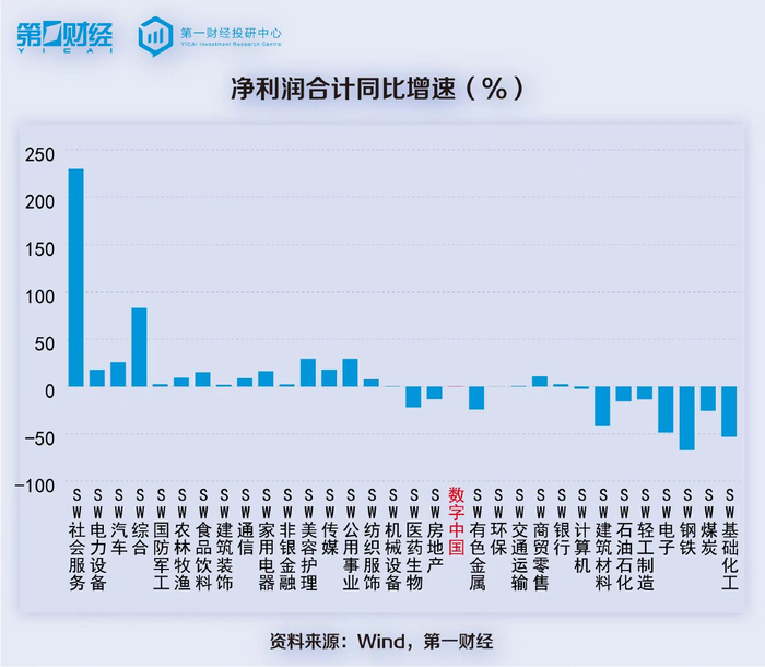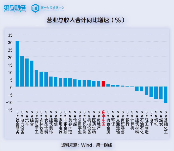 若和申万31个一级行业相比,数字中国概念股的总营收增速、净利增速分别排在第19位和第20位。