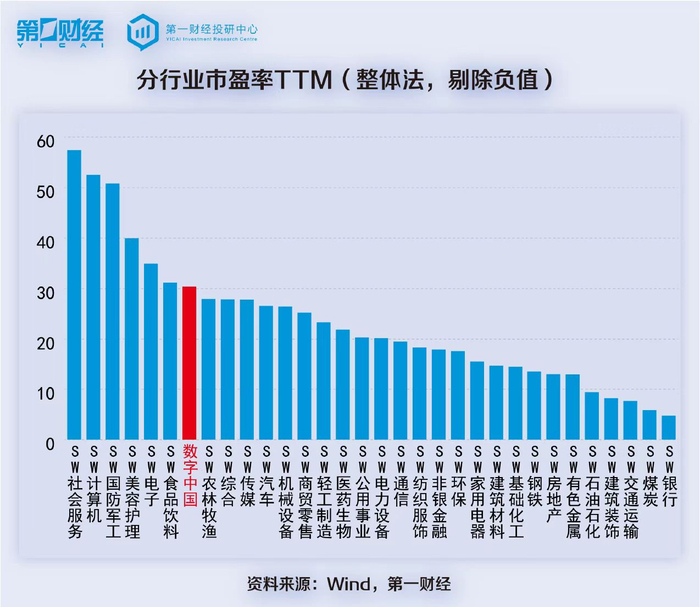 截至2023年9月1日,数字中国概念股PE(TTM,整体法,剔除负值)为30倍,和申万一级行业相比处于较高水平,显示市场认可其成长性与景气度。