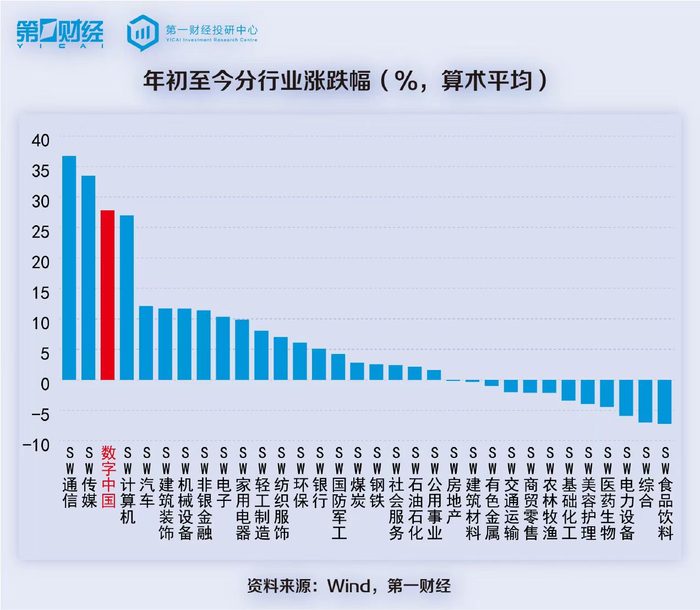 在产业政策和AI催化下,上半年数字中国概念股整体涨幅居前。和31个申万一级行业相比,数字中国概念股今年以来平均上涨27.82%,跑赢申万29个行业,仅次于通信和传媒行业。