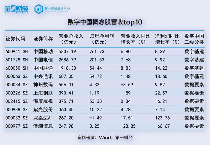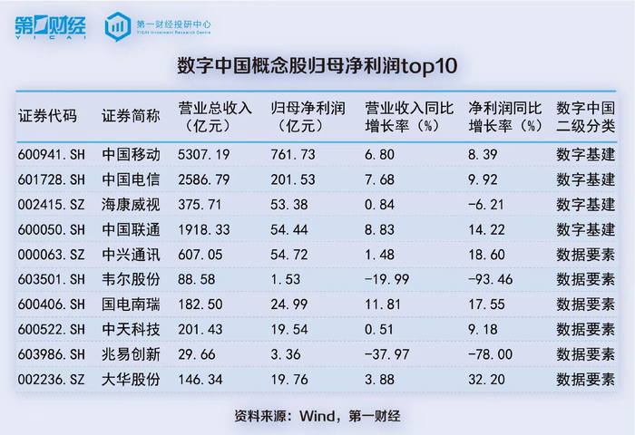 数字中国概念股上半年净利润超50亿元的有5家,分别是中国移动、中国电信、中兴通讯、中国联通和海康威视(002415.SZ)。