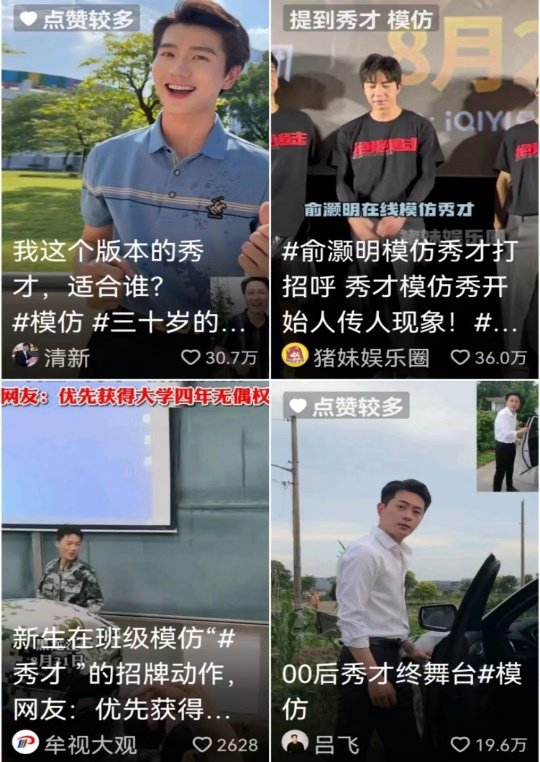 但底下也有网友说,目前的模仿者,没有完全模仿到秀才的神韵,他那张讨喜的脸才是精髓。还有人说,秀才的笑容最难学:突然闯入镜头,用笑容掩饰尴尬,好像舞台突然拉开帷幕,流露出一丝羞涩感。