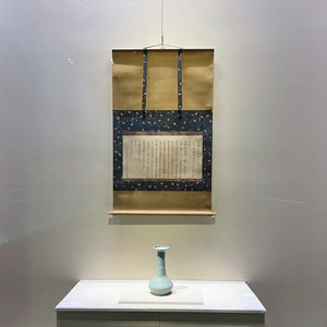 展览以两件中国南宋时代的书法和瓷器为始。书法作品为南宋僧人剑门妙深于淳祐九年(1249年)写给日本东福寺创立者圣一国师的一封信,讲述着两人共同的师父无准师范(1179-1249,是南宋时期最杰出的禅僧之一)临终前托付出版佛教经典的事宜;与之对话的是,一件来自中国龙泉窑的“青瓷筍形花瓶”,呈现出一种纯净无比的粉青色。