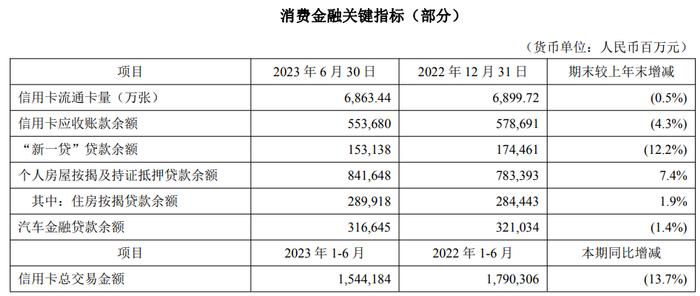 平安银行中报显示,截至2023年6月末,平安银行信用卡流通卡量6,863.44万张,较上年末微降0.5%;信用卡应收账款余额5,536.80亿元,较上年末下降4.3%,其不良率增加了0.20个百分点;受制于相对有限的消费复苏力度,上半年信用卡总交易金额15,441.84亿元,同比下降13.7%。
