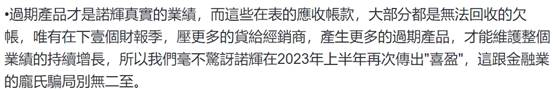 Capitalwatch的做空报告称,诺辉健康2022年实际销售额可能为人民币7695万元,与其公布的7.65亿元相差近9倍。诺辉健康通过压货维护整个业绩的持续增长,乃至到2023年上半年首度扭亏为盈,实质和金融业的庞氏骗局别无二致。