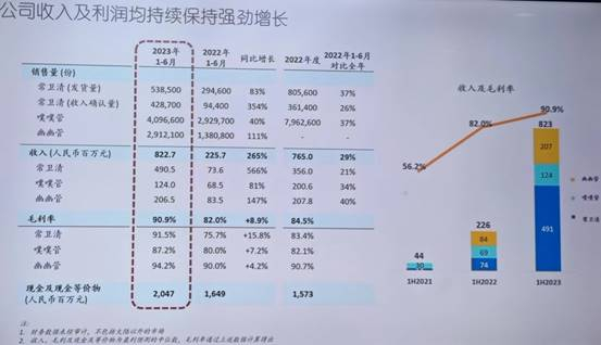 而且这三款产品的毛利率也在逐年快速增长。中报披露,幽幽管毛利率94.2%,甚至已经超过贵州茅台。根据茅台2022年报披露,其茅台酒的毛利率是94.19%。