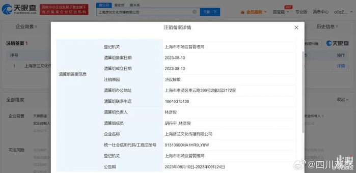 据天眼查APP显示,林彦俊名下共关联2家企业,均为存续状态,其中上海林彦俊影视文化工作室(普通合伙)成立于2018年8月,注册资本50万元人民币,林彦俊为执行事务合伙人并持股60%;上海彦兰文化传播有限公司成立于2019年4月,注册资本300万元人民币,由林彦俊任法定代表人并全资持股。近期,上海彦兰文化公司发布注销备案公告,公告期自8月10日至9月24日,注销原因为决议解散。