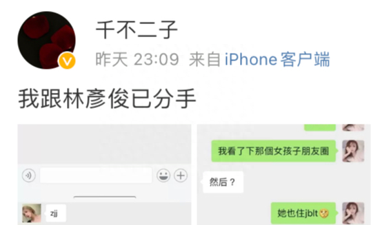 9月4日晚,网红千不二子发文称自己已跟林彦俊分手,并晒出多张聊天记录疑似指其男女关系混乱:“私底下玩得开又嫖娼这样的人真的值得你们喜欢吗?”