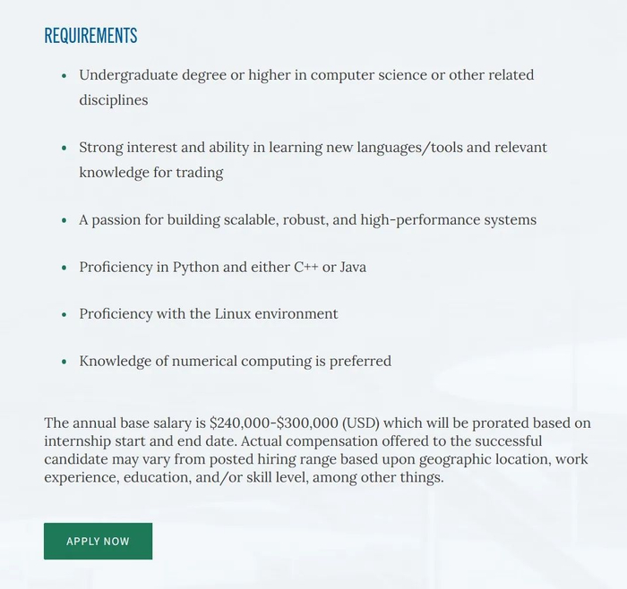 从招聘的对象来看,数学和编码日益成为全球对冲基金和量化投资员工所需要的技能,而高薪的背后,要求也是相当高,除了要求是海内外顶尖院校相关专业TOP 1%之外,还有“竞赛大神”“工程高手”等门槛。