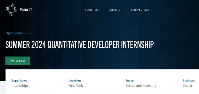 据证券时报9月5日报道,近日,“华尔街赚钱机器”的对冲基金公司——Point72在其官网发布2024年暑假的实习生招聘启事。其中,量化开发实习生岗位年薪为24万-30万美元,换算成人民币大约为174万-218万元。