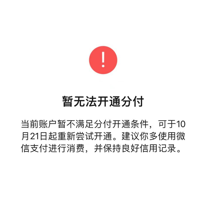 与其他互联网机构相比,微信上线消费金融类产品的节奏并不快。早在2020年3月,即有消息称微信在内测版中为部分用户提供微信分付功能。截至发稿,仍有部分用户无法使用该功能。腾讯客服表示,目前分付处于测试阶段,能否开通是系统评估等结果,无法人工干预。相关介绍显示,建议多使用微信支付,保持良好的信用行为,在提示的日期之后可重新尝试开通。