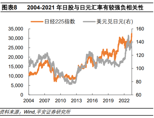 二是相对融资成本——日元汇率走贬意味着外资融资成本下降,往往能够吸引外资流入并提振日股。2004-2021年,日股和日元汇率呈现“跷跷板”走势。其中,2005-07年、2013-15年以及2016-17年的三段时期,日元汇率显著贬值并伴随股市走牛。