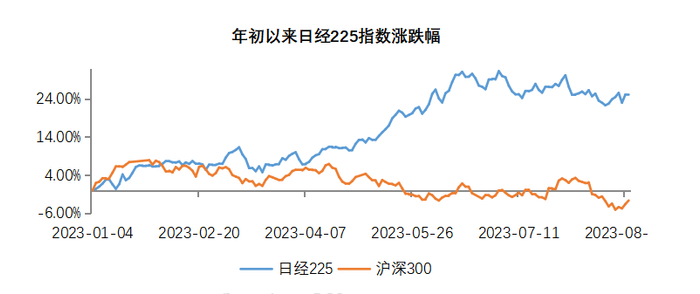 首先,美股“软着陆”预期和“科技牛”的双驱动下,全球风险偏好上升。随着美欧银行业危机的快速冷却,美国经济仍呈现韧性,美股快速修复,标普500指数在3月13日至6月16日期间反弹14%【可关注:标普ETF(159655)】,美股波动率指数(VIX)由3月均值21.6下降至5月的17.6,6月以来更跌至15以下、创防控后新低,显示出风险偏好上升,在此过程中日股表现积极。此外,今年以来“人工智能”概念驱动美国科技股走牛,截至8月31日,纳斯达克ETF(513300)今年来上涨41%,有较强科技属性日经225指数(48%为科技行业)也获得本轮“科技牛”的加持。