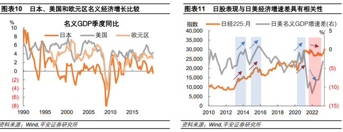三是相对名义经济增长——日本名义经济增长与美欧差距缩小时,日股表现较好;明显落后于美欧时,日股承压。2012年“安倍经济学”实施以来,日本经济曾经出现三轮“翻身仗”:2013Q2至2014Q1,2015Q1至2016Q2,以及2020Q4,期间日美名义国内生产总值同比增速差缩窄至2%以内甚至转正,日股均表现积极。2022年,日本经济受国际能源和食品价格上涨的负面冲击,而美国经济相对受益,使得日本名义经济增速落后美国超10个百分点,因此即便日元大幅贬值,日股并未受益。换言之,日本经济保持相对稳定,是“日元贬值利好日股”的前提。