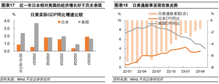 第三,日美名义国内生产总值增速差呈缩窄之势。2023年一季度,日本实际国内生产总值同比达1.9%,超过美国的1.6%,日美名义国内生产总值同比增速差缩窄至3.7个百分点,为2021年一季度以来最小差距。因此,即便目前日本经济仍处于“恢复性”增长,但是在美欧衰退风险的映衬下,表现相对亮眼。进而,去年流出日股的海外资金,在今年快速回流。