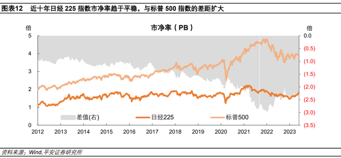 四是股票的相对估值变化——日股估值相对于美欧股票长期偏低,估值变化方向值得重视。日股估值长期偏低,2012-2022年,日经225指数的市净率(PB)平均为1.6倍,远低于标普500指数同期的3.1倍。从走势看,日经225指数估值在过去十年保持基本稳定,而美股估值则呈现明显上行趋势,继而日美股票相对估值距离拉大。当外资“习惯”日股的“便宜”后,后续的估值变化方向或更为重要。
