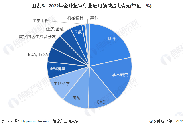从应用来看,全球超算行业应用主要集中在生命科学、CAE、机械工程、金融、EDA、地理、机械设计、政府、学术研究、国防和气象等领域。其中,政府和学术研究占比略高于其他领域,2022年分别达到21.64%和17.33%;CAE和生命科学紧随其后,2022年分别达到11.45%和10.37%;其余领域占比均不超过10%。