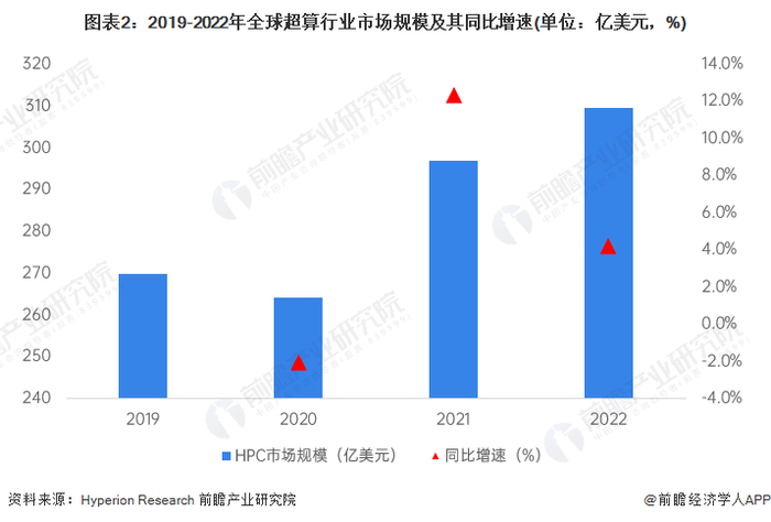 近年来,IT行业的扩张、虚拟化的进步以及对混合高性能计算解决方案的需求增长推动超算市场规模日益扩张。受益于其以更高的速度处理大量数据的能力,HPC系统受到政府机构、国防机构、学术机构、能源公司和公用事业单位广泛采用。根据Hyperion Research的统计数据,2022年全球超算行业市场规模为309.55亿美元,同比增长4.24%。