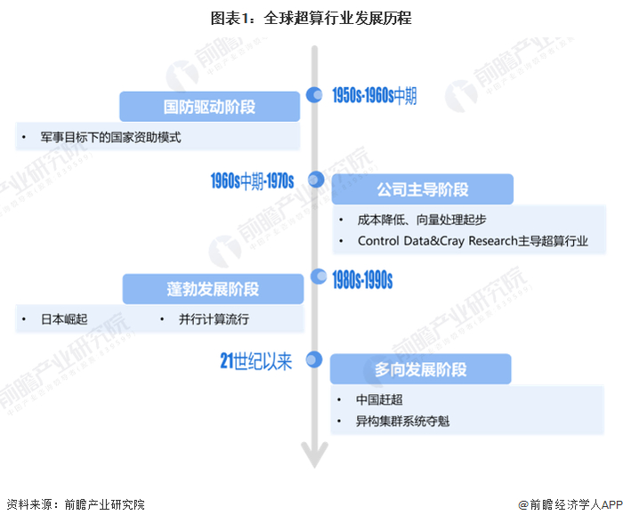 全球超算行业主要经历了以下发展历程:国防驱动阶段——公司主导阶段——蓬勃发展阶段——多向发展阶段。21世纪以来,美、日两国依旧是超级计算机研发大国但是不再具有垄断地位,中国逐渐赶超,超级计算机开始呈现多极化发展。异构集群系统的应用进一步提高了超级计算机性能,每秒千万亿次的P级超级计算机已经相对成熟,各个国家的科研机构和供应商正在积极研制E级超级计算机。