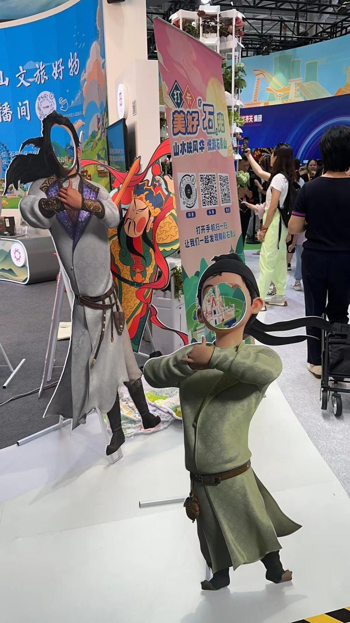 叉手行礼的李白、坚毅质朴的高适、憨态可掬的小杜甫……在首钢园2号展馆“京西福地 山水文化融城”主题展台,许多年轻人和小朋友正在排队等待与电影《长安三万里》的角色立牌合影拍照。