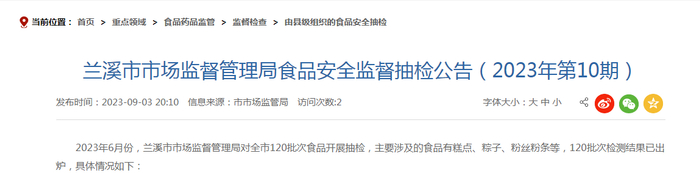 浙江省兰溪市市场监管局发布2023年第10期食品安全监督抽检公告