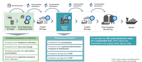 由中理检验ISCC&RSB认证、生物能源领域、绿电及绿氢资源资深专家团队共同根据隆基绿能的绿色甲醇生产技术方案,经过对其各能源结构、不同原料、各运输路线、不同生产工艺、不同减排方案等多因素进行现场调研、数据收集、分析评估,帮助其实现了各环节符合国际认证和欧盟标准要求,从原料种植、原料收集和处理、甲醇生产加工、原料与产品运输、仓库和贸易等环节减排设计,预计可实现每干吨船用燃料(绿色甲醇)减排量远远超过欧盟“可再生能源指令(Renewable Energy Directive,RED II)”和“Fuel EU Maritime”法规的碳减排(生物燃料65%,非生物质可再生能源70%)和碳强度降低(2030年下降6%)的要求。