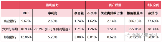 截至6月末,邮储银行不良贷款率0.81%,较上年末下降0.03个百分点,为商业银行平均水平1.62%的一半;拨备覆盖率381.28%,约为行业平均水平的1.8倍;关注类贷款占比0.62%,约为行业平均水平2.14%的四分之一。