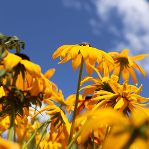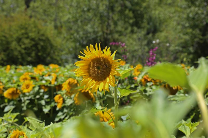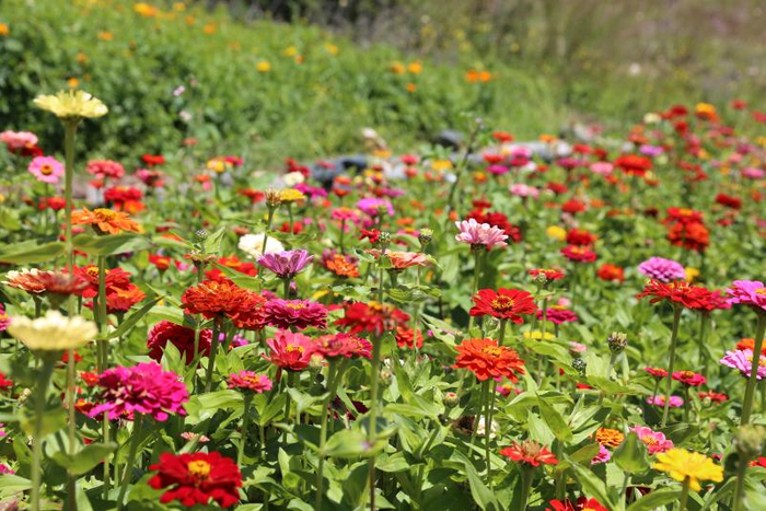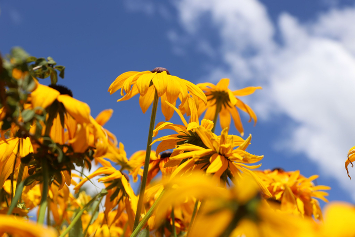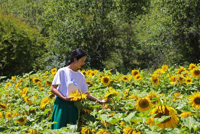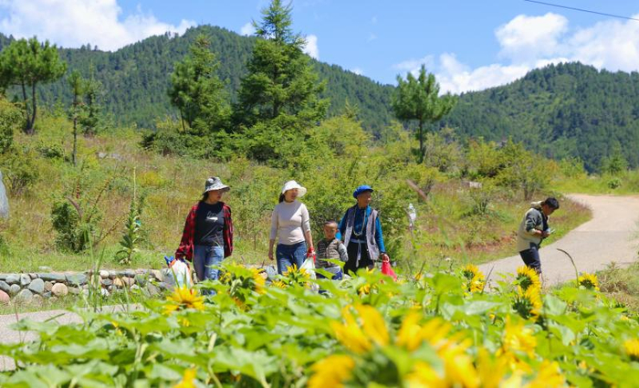 田间万寿菊、百日菊、黑心菊、向日葵等簇拥盛放,万里晴空下,朵朵菊花在秋风中摇曳生姿,蜜蜂飞舞、蝴蝶翩跹,绘出了一幅色彩缤纷的秋日画卷,令人赏心悦目。