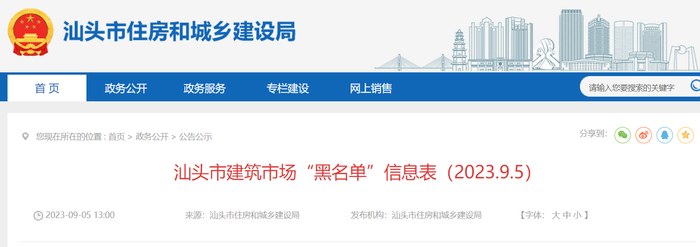 广东省汕头市建筑市场“黑名单”公布(2023.9.5)