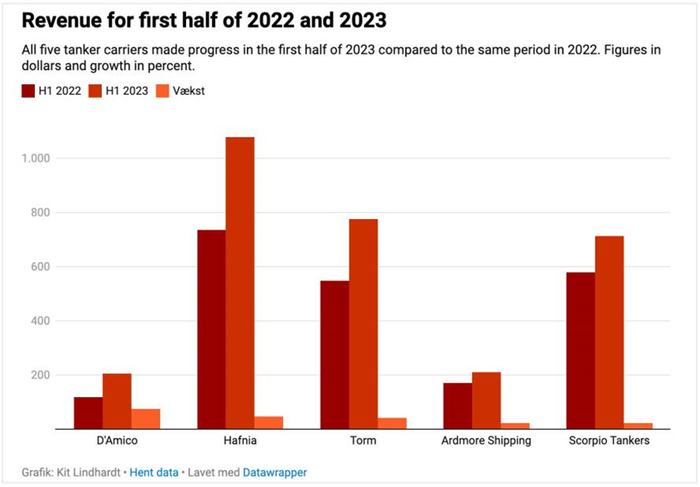 经分析发现,以上五家公司今年上半年的盈利水平均远超去年同期。具体来说,这些公司报告期内的营业收入达30亿美元(略高于200亿丹麦克朗),同比飙升39%;净利润同比增长了近两倍,接近13亿美元(90亿丹麦克朗),相当于去年创纪录的22亿美元的60%。