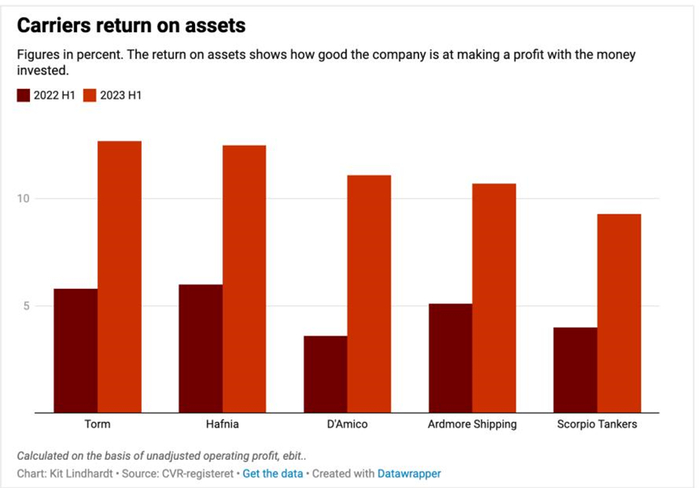 从今年上半年的营收、净利润数值来看,Hafnia在对比的五家油轮公司中名拔得头筹,Torm紧随其后,天蝎座油轮位列第三;从今年上半年的营收、净利润同比增长幅度来看,d'Amico以54.5%和419.5%的增幅同时位列第一,占据绝对优势;从资产回报率(ROA)来看,Torm以12.7%的资产回报率(ROA)位居前列,Hafnia紧随其后,d'Amico位列第三。