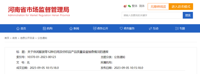 中国质量新闻网讯 据河南省市场监督管理局网站2023年9月5日消息,近期,河南省市场监督管理局组织开展了休闲服装等12种日用及纺织品产品质量监督抽查。现将抽查情况通报如下: