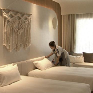 走进位于新河镇的拾花民宿,民宿管家张雨露正在整理客房,入职拾花民宿已有两年的她,曾在多家星级酒店工作过。