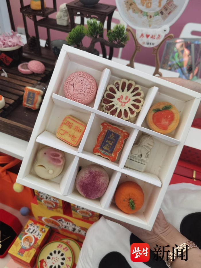 记者看到,“九宫格糕点”礼盒内配有复古精巧的“胭脂盒”,宫廷味十足的“玉玺糕”、“点心殿”、“狮子门墩”,以及软萌可爱的“兔兔饼”、“枣花酥、“蔓越莓饼”和惟妙惟肖的“橙橙子”、“桃果”。工作人员说,这些款是现烤点心所以保质期只有3天,只在实体店售卖,礼盒里的小点心还有其他选择可替换。