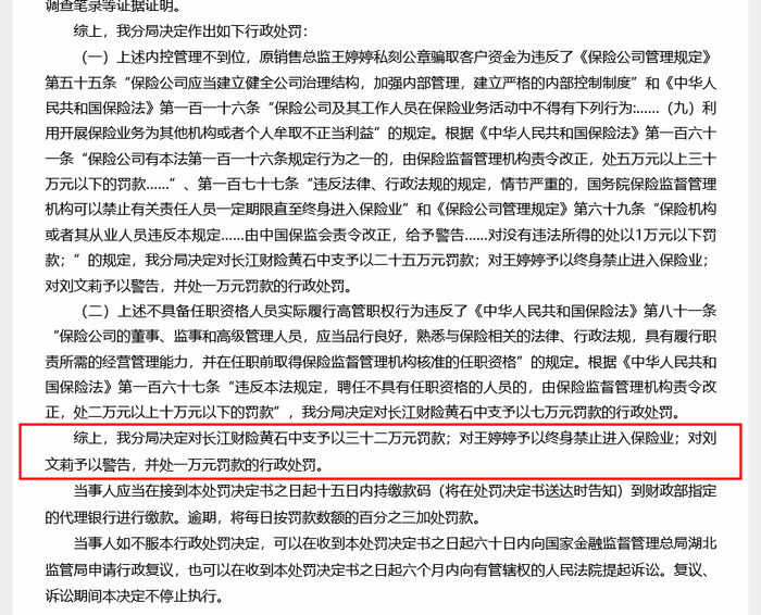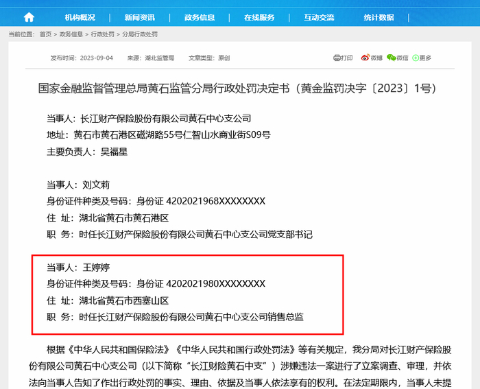9月4日,国家金融监督管理总局官网发布信息, 长江财产保险股份有限公司黄石中心支公司(以下简称“长江财险黄石中支”)原销售总监王婷婷私刻公章、骗取客户资金,被终身禁止进入保险业。