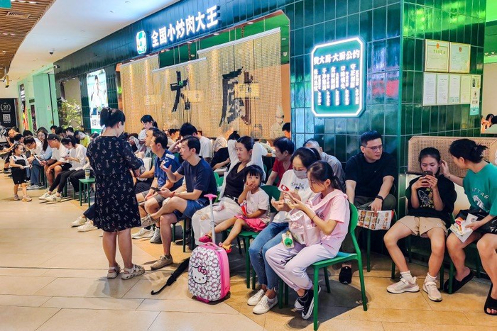 在上海七宝万科广场,只见商场内人头攒动,位于 B1层的费大厨辣椒炒肉门口已挤满了众多排队等位的顾客。记者从迎宾台随机取了一个2人桌的等位小票,上面显示排队等位桌数已超过100桌,服务人员告诉记者,等位时长可能需要将近2小时。