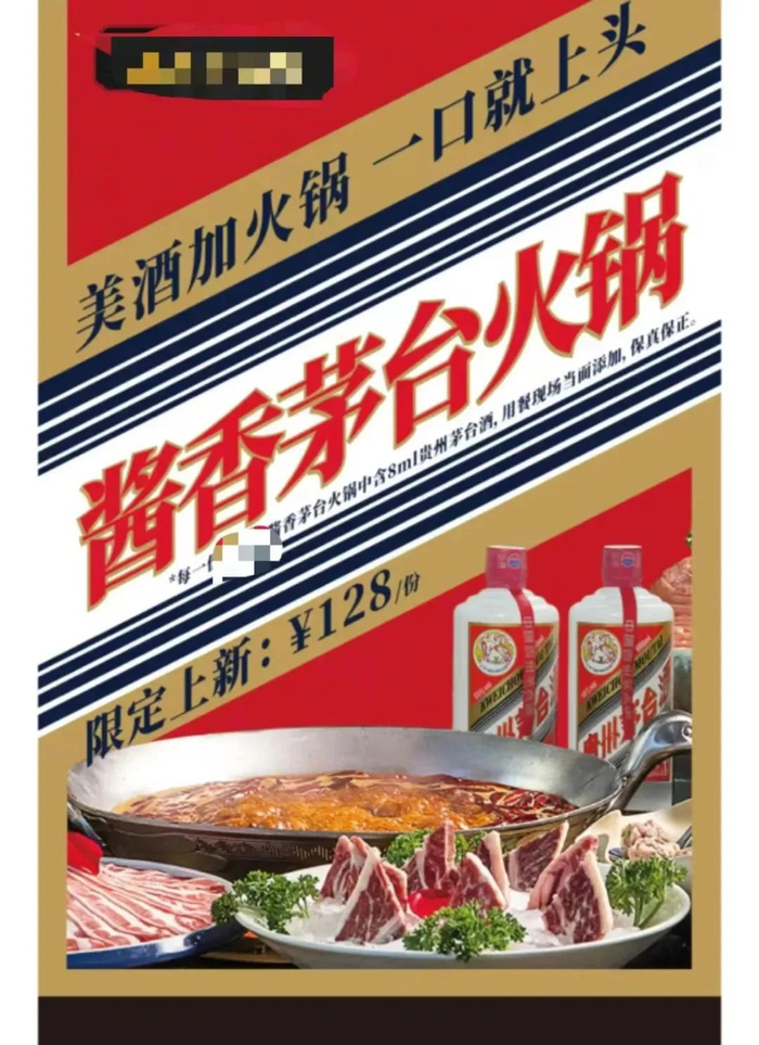 据悉,该店于9月4日下午在微信公众号发表了标题为《酱香茅台火锅,重磅上新,邀您品鉴!》的推文。在该条推文内置的宣传海报上,写有“美酒加火锅,一口就上头”的宣传标语,整体海报样式也与茅台经典款瓶装别无一二。