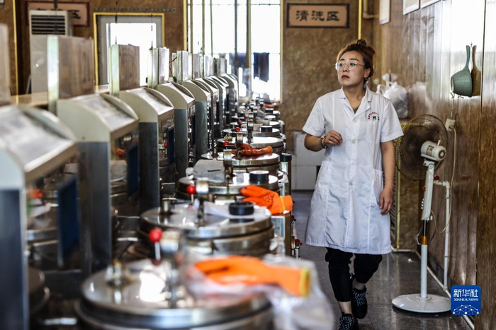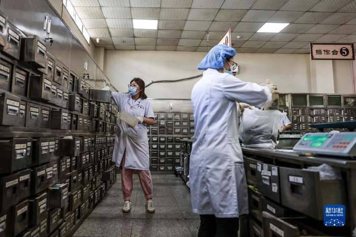 9月5日,在文登区人民医院医共体中药配送中心,工作人员在制备中药。近年来,山东省威海市文登区以国家中医药综合改革试验区建设为契机,在全区范围内推广“基层巡诊+中医药服务”模式,设立中药配送中心,全链条保障中药饮片质量安全。目前,文登区有包括1所三级甲等中医院在内的230多处中医药服务机构、164个中医药参与的家庭医生服务团队,建立起覆盖区镇村三级的中医药服务体系。新华社记者 朱峥 摄